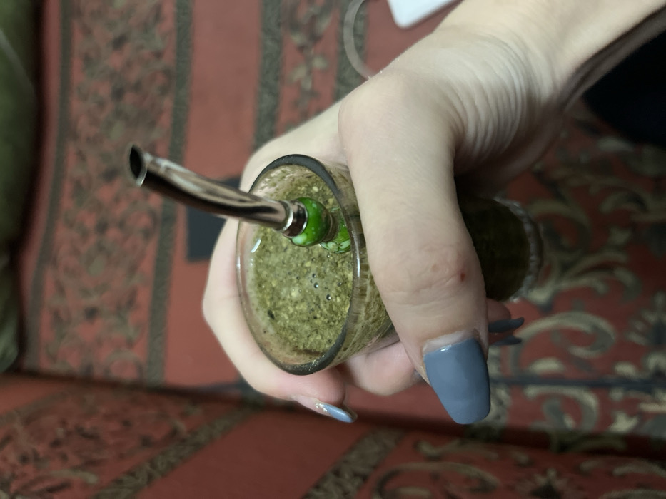 A hand holds a glass containing yerba mate with a bombilla (metal straw) inserted