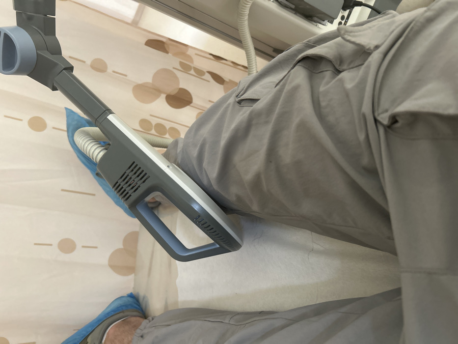 The image depicts a close-up, first-person perspective within a medical facility in Plovdiv, Bulgaria. A person's lower body is visible, clad in light gray cargo pants. Both feet are covered with disposable blue shoe covers. The individual's legs rest on an examination surface covered with white disposable paper. A gray and white medical device, featuring a handle-like grip, vents, and a flexible corrugated hose, is positioned over the person's right thigh. This device appears connected to a larger, partially visible medical apparatus on the right. In the background, a beige privacy curtain patterned with repeating brown circular shapes and vertical lines encloses the examination area.