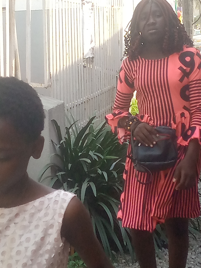 two individuals outdoors in Iranla, Nigeria. In the right half of the frame, a woman with dark skin and long, dark, curly hair stands, looking towards the viewer with a neutral expression. She is wearing a coral pink long-sleeved dress featuring black vertical stripes and scattered black numerals. Her left wrist displays beaded bracelets, and she holds a small black crossbody bag with her right hand. Partially visible in the lower-left foreground is the back of another individual's head and left shoulder. This person has short, dark, curly hair and wears a light-colored, possibly white or beige, sleeveless top with a textured, possibly dotted, pattern. The background consists of a light-colored metal fence or gate with vertical bars, across which diagonal shadows are cast. Between the individuals and the fence, a dense growth of green, long-leafed plants is visible. The ground appears to be covered with light-colored gravel or small pebbles. The scene is illuminated by natural light.