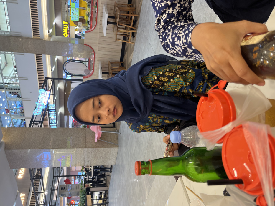 A woman wearing a dark blue hijab and a batik-patterned top sits at a table in a brightly lit mall food court. She looks off to the side. Next to her, another person's hand is holding a bottle. The table holds two drinks with orange lids and black straws, a small bottle of water, and a green bottle with an orange rubber band around its neck. The background features pillars, signs like "Penyelatan Co," and various food court establishments.