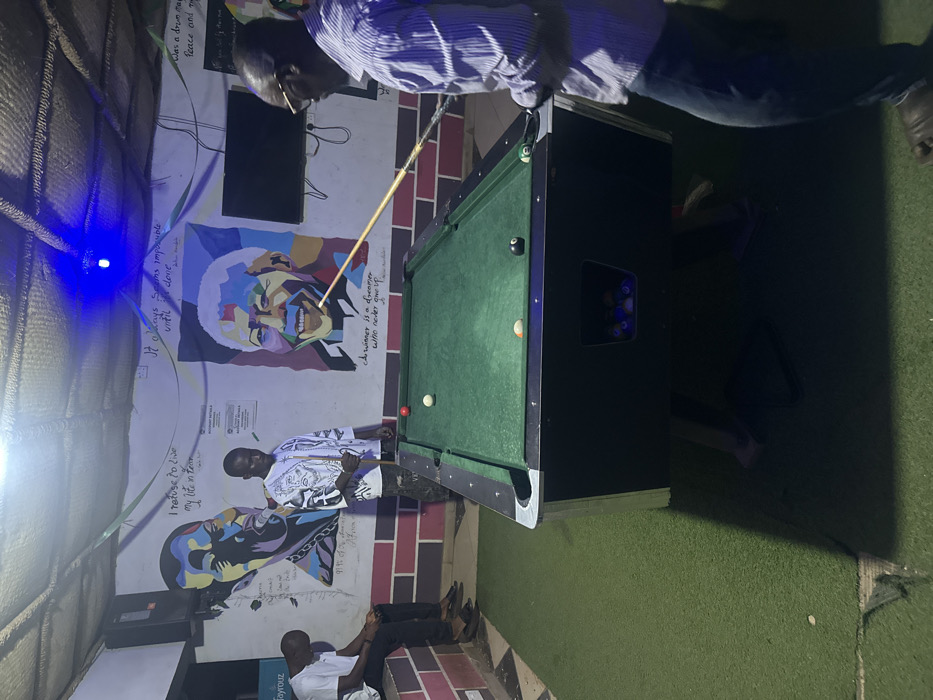 An indoor scene shows a pool table with several people around it. One man is poised to strike a cue ball with his pool cue. The wall features artwork, including a colorful portrait of Nelson Mandela, and inspirational quotes like "It always seems impossible until it's done," and "A dreamer is a dreamer, who never gave up." Another quote reads, "I refuse to live my life in fear." The lighting is dim, with a blue light fixture in the upper left.