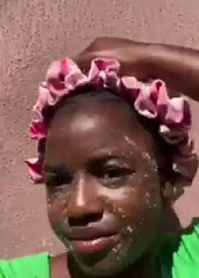 A young woman with dark skin is standing in front of a textured wall. She is wearing a green t-shirt and a patterned pink and white hair bonnet. Her face appears to be covered in a light-colored granular substance. She raises one arm and puts her hand behind her head. The area is sunny and outdoors.