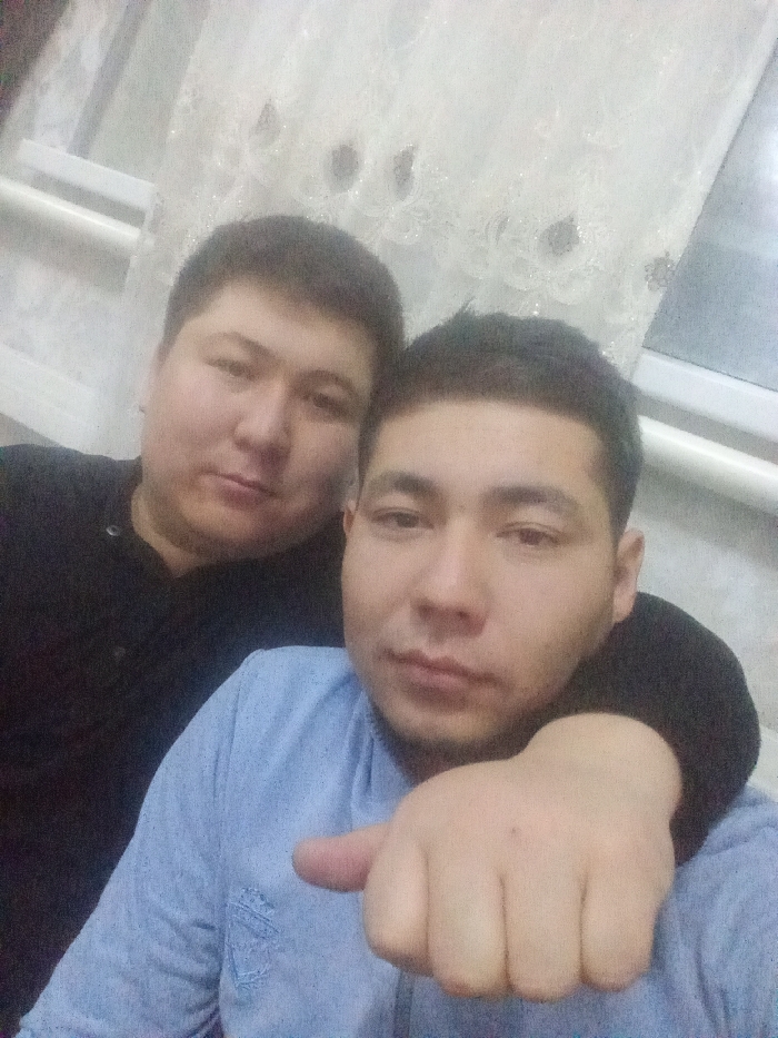 Two men pose closely for a selfie. The man in front wears a light blue shirt and extends his hand towards the camera in a thumbs-up gesture. The other man stands behind him, wearing a black shirt, and appears slightly above. Both have dark hair and similar complexions. A window and patterned white curtains are visible in the background, with a light fixture on the upper left.