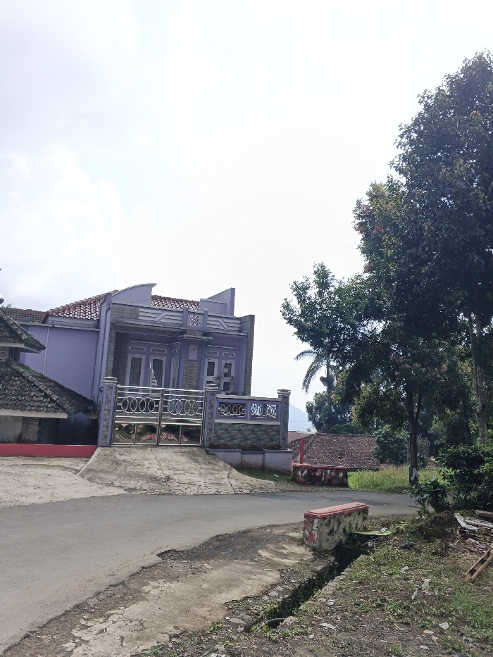 A lavender-colored house with a red-tiled roof is partially visible behind a silver gate. A concrete driveway leads up to the gate from a paved road, which runs parallel to a ditch lined with stones. Tall green trees obscure part of the right side, with another house partially visible in the background. The sky is overcast.