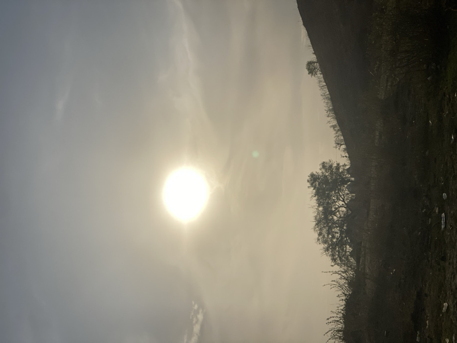 A landscape view under a hazy, sunlit sky. The bright sun dominates the left side, obscured by a thin layer of clouds. A grassy hillside occupies the right portion of the image, punctuated by a few trees. The scene is slightly washed out and lacks sharpness.