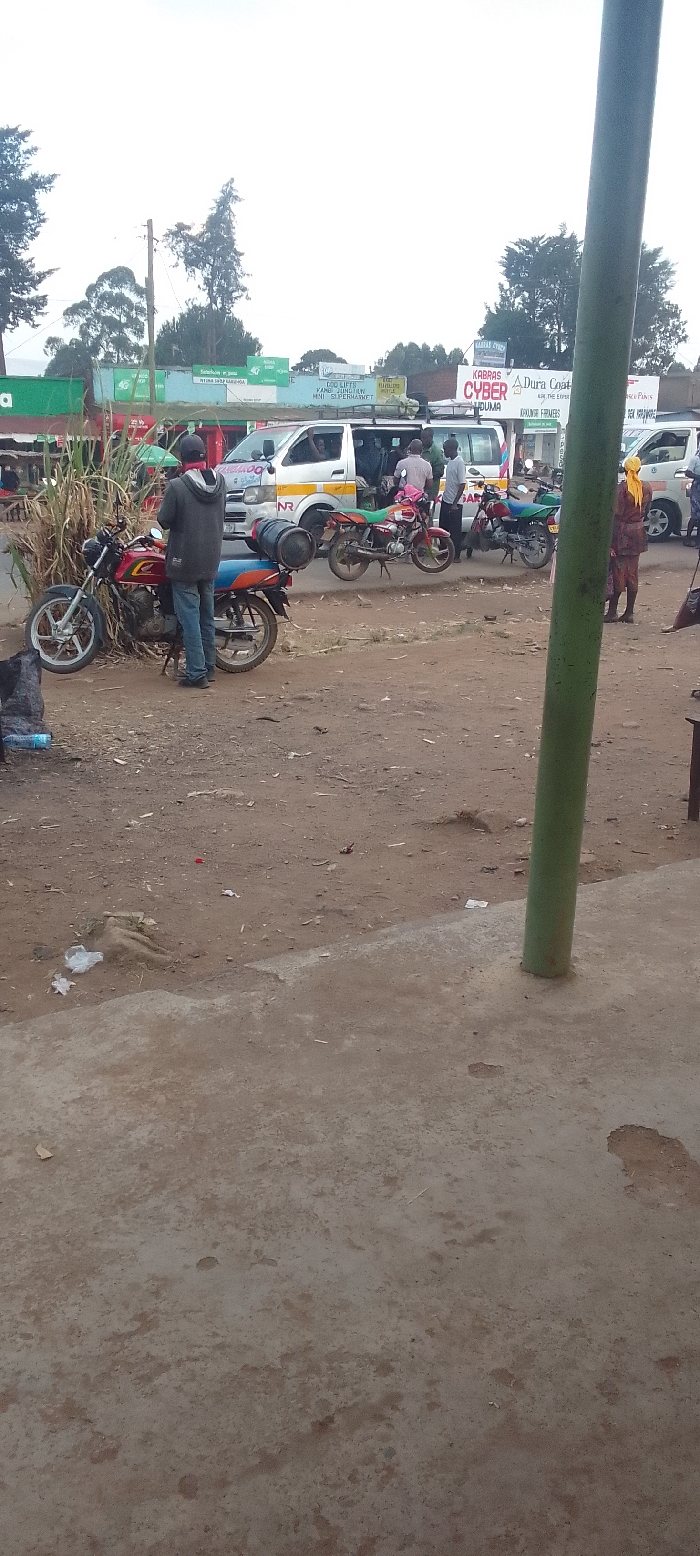 street scene in Kakunga, Kenya, taken from a vantage point near a green pillar. The street is made of dirt and is relatively empty, with only a few people and vehicles present. There are several motorcycles parked on the left side of the image, and a white van with a sign above it that reads "Kabras Cyber". One of the motorcycles is a red and black model with a person standing near it, presumably the owner. The van has a sign above it, likely advertising a local business. On the right side of the image, there is a woman wearing a yellow head scarf standing near a building. The street appears to be in a commercial area with several buildings along its edges. There are trees and vegetation in the background, including a tall green bush on the left. The overall impression is that of a typical street scene in a rural area in Kenya.
