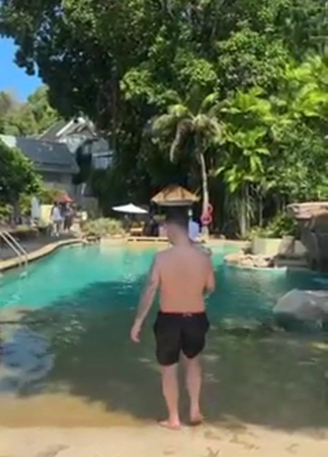 shirtless man in black shorts walking into a swimming pool while holding a toddler dressed in light-colored clothing and a white hat. The pool is surrounded by lush green trees and plants. A few people are visible in the background near the pool deck. The setting appears to be a sunny day at a resort or hotel with a tropical theme. The man seems to be testing the water temperature as he slowly steps into the pool.