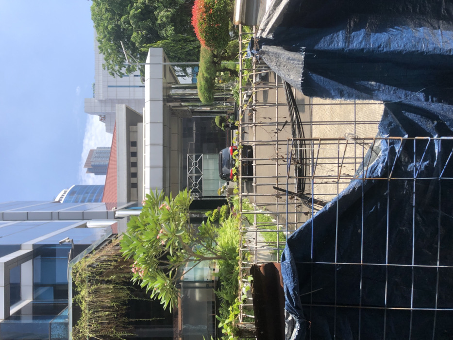 A vertical view shows a modern building with a white facade and glass windows. A black car is parked in front. In the foreground is a metal grid fence partly covered with a blue tarp. Greenery and plants fill the space between the fence and the building. In the background, several other buildings are visible against a blue sky.