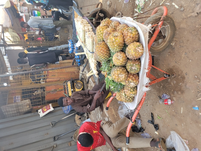 A wheelbarrow, filled with pineapples and corn, rests on a dirt road. Two men sit nearby. One is in brown, and the other wears a red shirt. In the background, people mill around a market scene, with shops and pedestrian activity. A generator sits near the wheelbarrow, and there is debris on the ground.