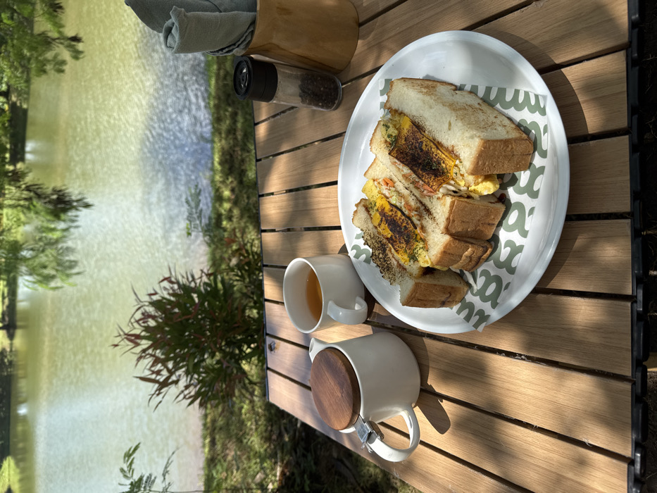 A serene outdoor scene presents a wooden table with a picturesque lake view. A plate of sliced sandwiches, likely egg-based, sits beside a cup and a small teapot, suggesting a meal. A pepper grinder and a holder for utensils are placed at the top. The scene exudes a sense of tranquility and enjoyment of nature with a simple meal.