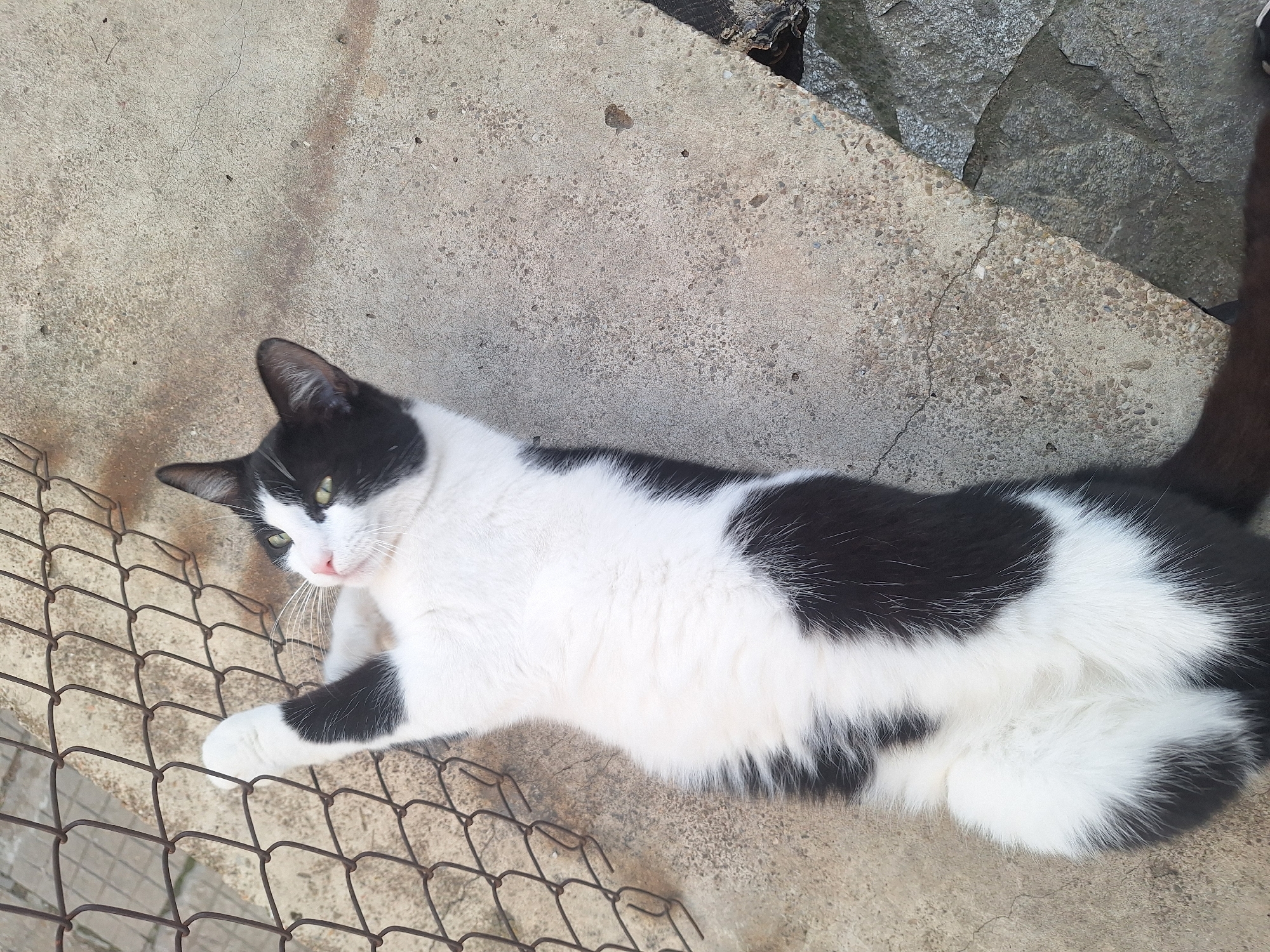 - "The scene is an outdoor ground-level view captured in Elena, Bulgaria, depicting a bicolored cat lying horizontally on a light gray concrete surface" by FM-qHcEz1, licensed under CC BY 4.0
