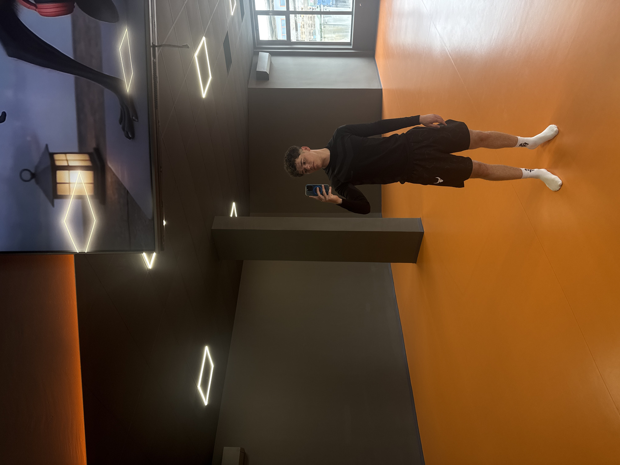 A young man stands sideways in a building. The floor is orange. The man is wearing black clothing and white socks. He is holding a phone. There is a large screen on the wall showing a cartoon. The room is illuminated by recessed ceiling lights and diamond-shaped wall lights. A window is visible. It is impossible to confirm the exact location in Goce Delchev, Bulgaria.