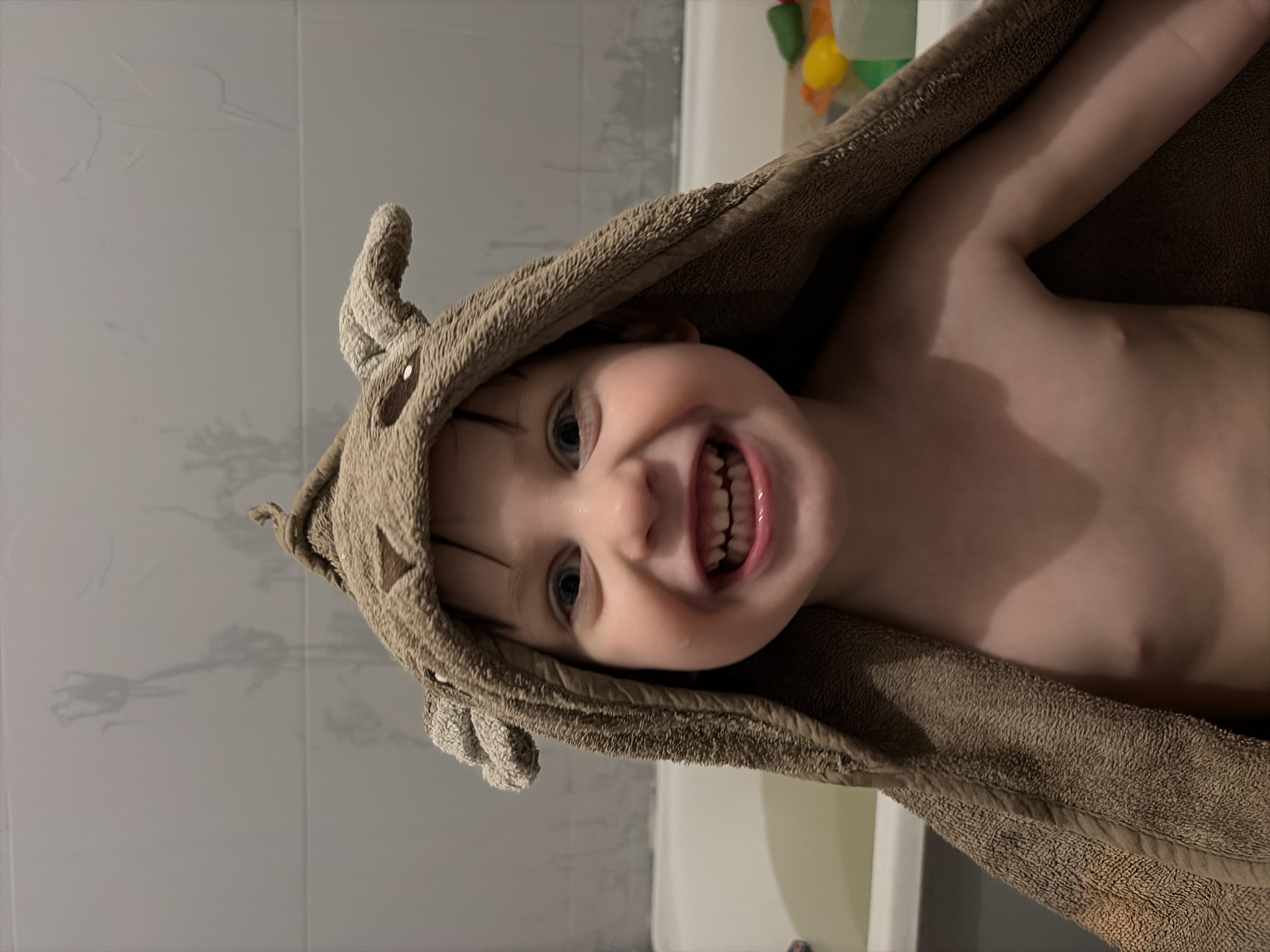 - "A young child is wrapped in a brown, hooded towel, smiling broadly with visible teeth" by FM-tvM5r1, licensed under CC BY 4.0