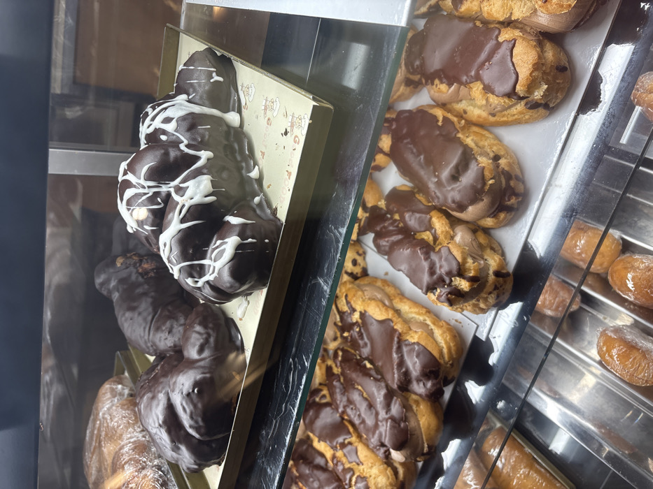 A display case reveals a variety of pastries. On the left, chocolate-covered treats, some with white frosting drizzle, are arranged in a box. To the right, rows of chocolate-covered éclairs are visible on trays, followed by smaller, round, glazed pastries individually wrapped. The pastries vary in shape and icing, showcasing a sweet assortment behind the glass.