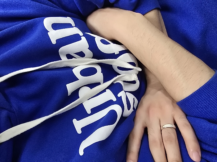 A close-up perspective of an unidentified individual's upper torso and arms in Daegu, South Korea. The person is wearing a royal blue hooded sweatshirt featuring prominent white drawstrings. The chest area of the sweatshirt displays the white, stylized text "Urban," with the initial letter 's' of a subsequent word partially visible below it. The individual's left hand, adorned with a silver-colored band-style ring on the ring finger, rests on the torso. The right forearm, exhibiting fine, dark hair, extends across the body. Both arms are enveloped by the blue fabric of the hoodie. The background is entirely obscured by the subject, providing no environmental details.
