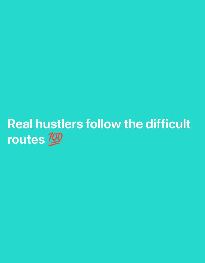 A turquoise background displays the white text "Real hustlers follow the difficult routes 💯