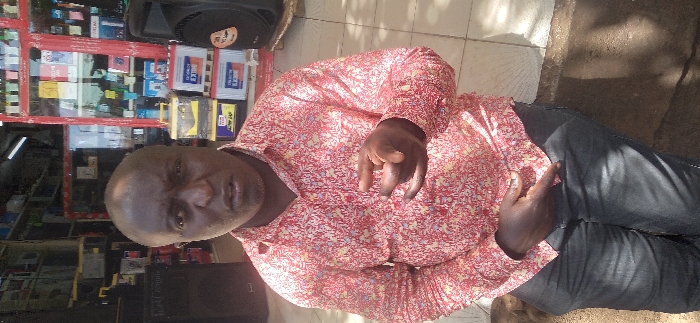 A man in a patterned shirt and dark pants poses in front of a store display. The shelves behind him are stocked with various items, including batteries. The man's expression is neutral as he gestures slightly with one hand. A large speaker sits on the top shelf. The scene is bathed in natural light, with shadows visible on the ground.