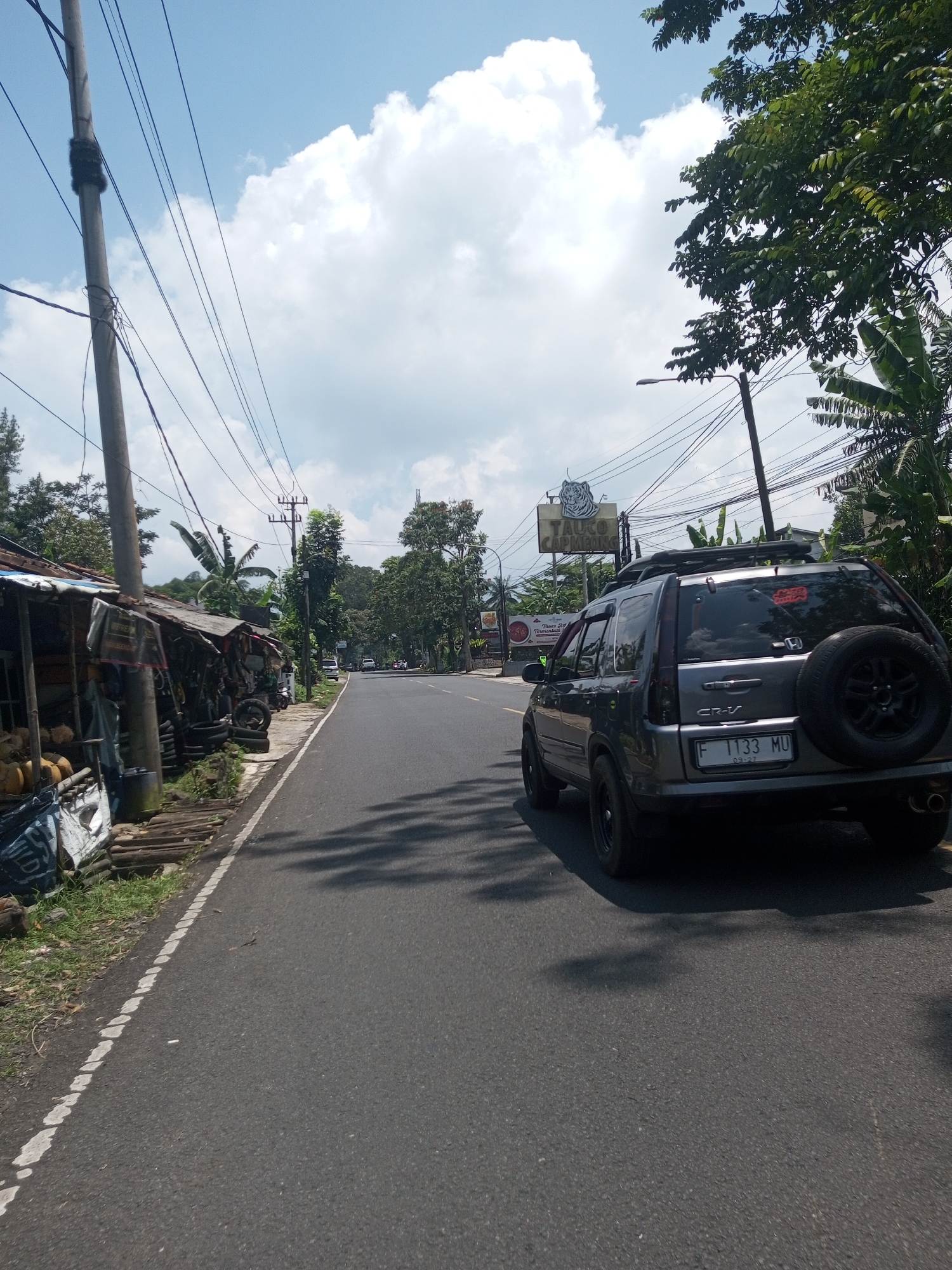 A daytime shot of a road with an SUV on the right side, its license plate reading "F 1133 MU." Roadside businesses line the left, selling tires and goods. Overhead power lines crisscross, with lush trees flanking the scene. A sign is visible further ahead on the right. The location cannot be determined as Nawng Hkar, Myanmar based solely on this image.