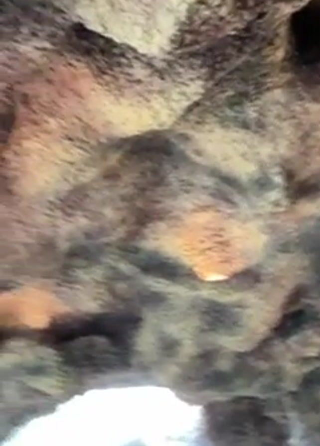 n overhead view of a rocky structure, followed by a view of an elephant in an enclosure with trees and a pool