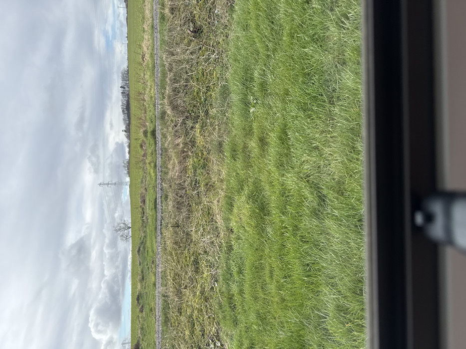 The image presents a static view of a rural landscape, observed through the lower portion of an out-of-focus dark window frame or sill. The immediate foreground consists of vibrant green grass, transitioning to a strip of dry, lighter green and brown vegetation. A narrow, unpaved track, appearing to be dirt or gravel, runs horizontally across the mid-ground. Beyond the track lies a large field of cultivated green vegetation, gently rising towards the horizon. In the background, under a partly cloudy sky showing patches of blue, a solitary bare tree is visible on the left side of the horizon. Centrally positioned in the background is a lattice-steel electricity pylon with associated power lines extending horizontally. To the right of the pylon, a dense line of mixed deciduous and evergreen trees marks the distant edge of the field. No individuals or animals are present, and no actions or interactions are depicted. This scene is located in Fowlis Easter, United Kingdom.