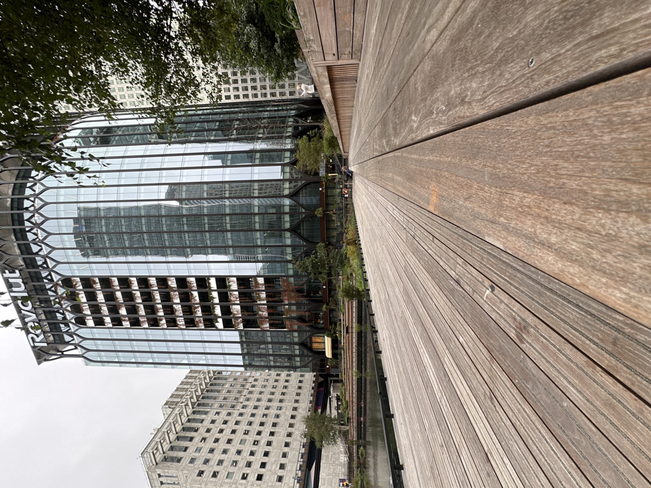 - "The image presents a low-angle perspective across a wooden boardwalk in Canary Wharf, London, United Kingdom" by FM-tAd7y1, licensed under CC BY 4.0