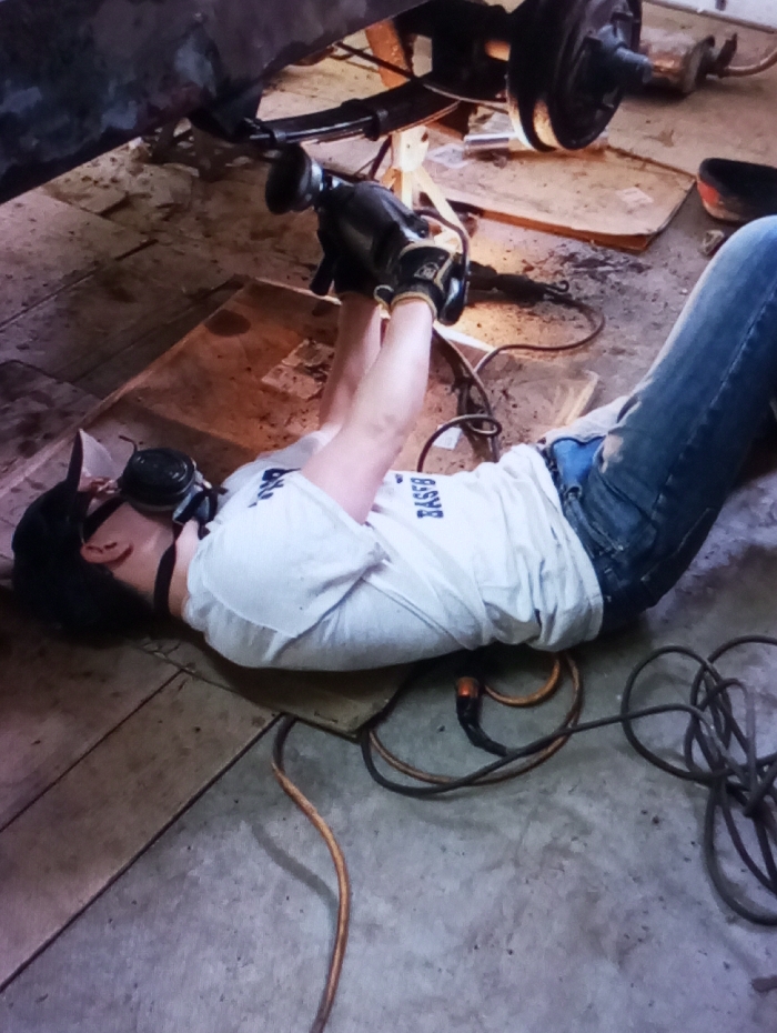 - "An individual is depicted lying supine on a concrete and wooden plank floor within an indoor workshop setting in Riga, Latvia, engaged in vehicle maintenance" by FM-1UPjC3, licensed under CC BY 4.0