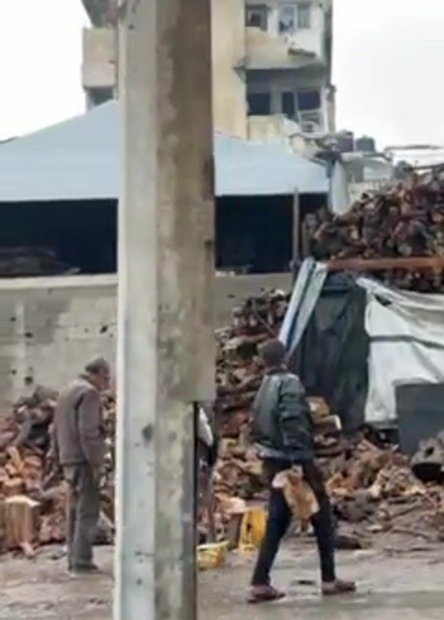 A group of four people, including three children, are gathered near a large pile of chopped wood on a wet, grey day. A man takes a swing at a piece of the wood with a large tool to split it. Behind them is a block structure with bullet holes and a grey roof. A damaged building is visible in the background.