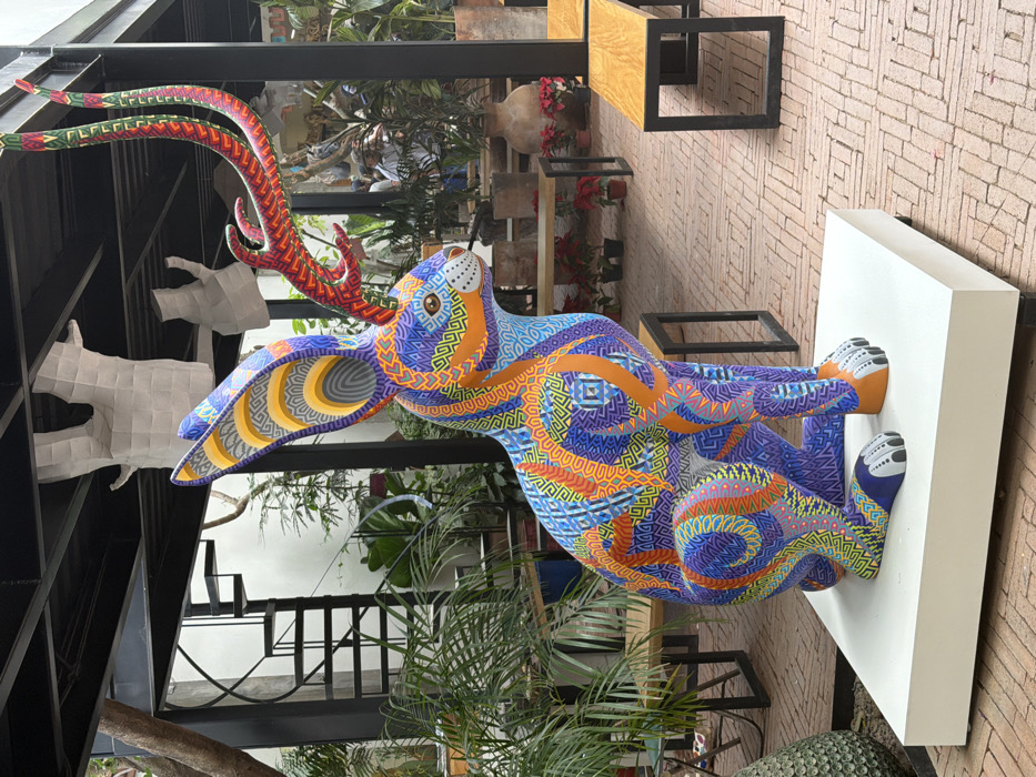 An intricately painted rabbit-like creature with antlers sits perched on a white base against a brick wall. The creature's blue and orange body is covered in geometric patterns. Nearby, a structure with black metal framing supports plants and other decorative objects. Other white animal sculptures appear in the background, creating a vibrant and artistic setting.