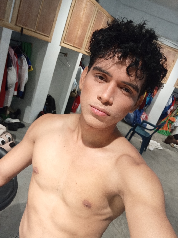 A shirtless young man with curly dark hair gazes into the camera. Overhead cabinets line the background, with a closet and assorted clothing to the left. A black backpack and Mickey Mouse plushie are visible near the closet. A blue plastic chair and laundry are situated on the right side of the frame. The man is well-lit, showcasing his chest and shoulders.