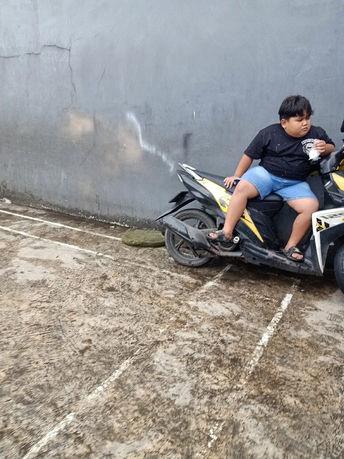 A person sits atop a yellow and black motorbike. The person is wearing a black t-shirt and denim shorts, and holding a white cup. The motorbike is parked on a concrete surface marked with white lines, adjacent to a gray wall. A green object rests on the concrete behind the bike's rear wheel. The overall scene appears to be outdoors, possibly a parking area or a courtyard.