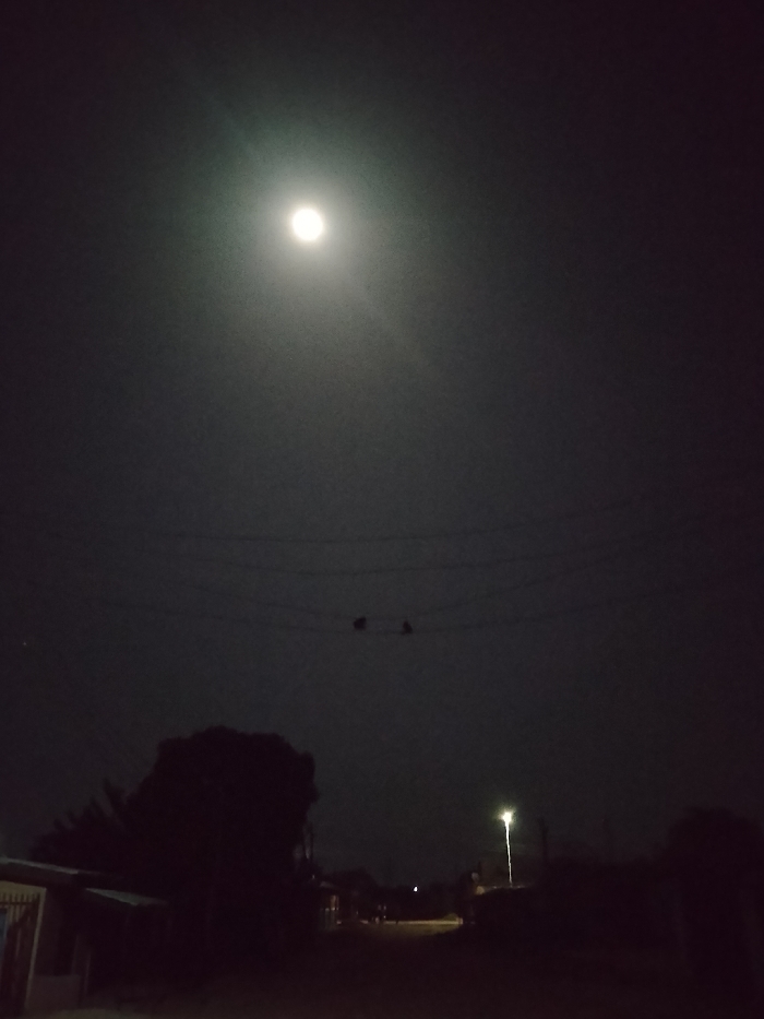 This image depicts a nighttime scene in Narayi, Nigeria. A bright, full moon illuminates a dark sky from the upper-center. Below the moon, multiple horizontal power lines traverse the frame. Two small, dark silhouettes, consistent with birds, are perched on one of these power lines slightly to the right of the vertical center. In the lower left quadrant, the roofs and partial structures of buildings, possibly residential, are visible, including a section of a white wall or fence. A large, dark mass of foliage, likely a tree, occupies the lower-mid section, obscuring parts of the view. A street extends into the distance, faintly visible, with a single, bright streetlight on a pole positioned on the right side of the street, further down. The scene is devoid of discernible human figures or overt activity.