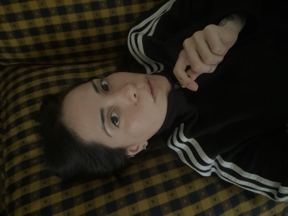 A young woman reclines on a yellow and black checkered surface, her head resting on the fabric. She wears a black jacket adorned with three white stripes along the sleeves. Her dark hair contrasts with her fair skin. Her gaze is directed towards the viewer, her expression serene. Her right hand, positioned near her collarbone, gently touches the fabric. A small earring is visible in her ear. A tattoo is spotted on the wrist of the hand.