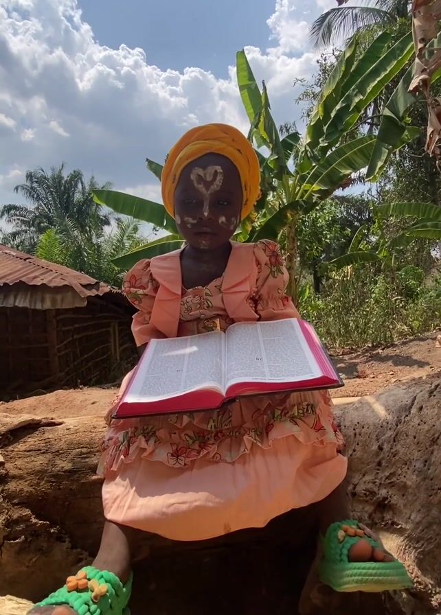 A young girl is sitting on a fallen tree trunk, holding an open Bible in front of her. She is wearing a dress, sandals, and a head wrap. Her face has a painted heart on the forehead. Behind her are trees, and a partially-visible building with a tin roof. The sky is bright blue with white clouds. An off-screen voice asks her if she is reading the Bible.