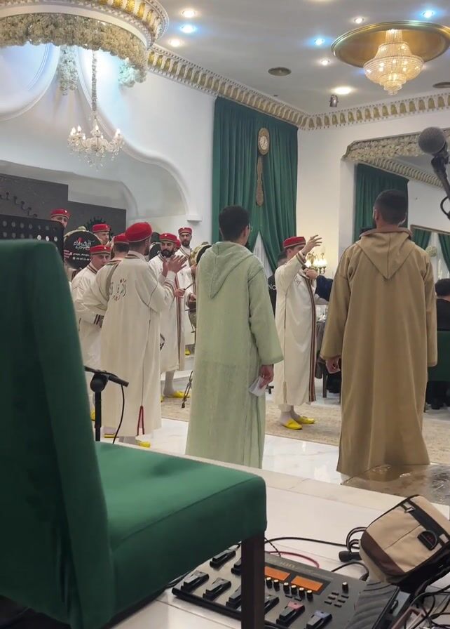 A live performance is underway, with a group of men clad in traditional North African attire, predominantly white robes and red hats, singing a cappella in a formal setting. Two men stand in the foreground, one in a light green robe and another in a beige robe, facing the performers. In the background, a woman in a long blue dress can be seen raising her arms, possibly in enjoyment or participation. A stage monitor is visible at the bottom of the frame. The interior space is ornately decorated with chandeliers, and green curtains. The overall ambience suggests a cultural celebration or a formal event taking place in a sophisticated venue.