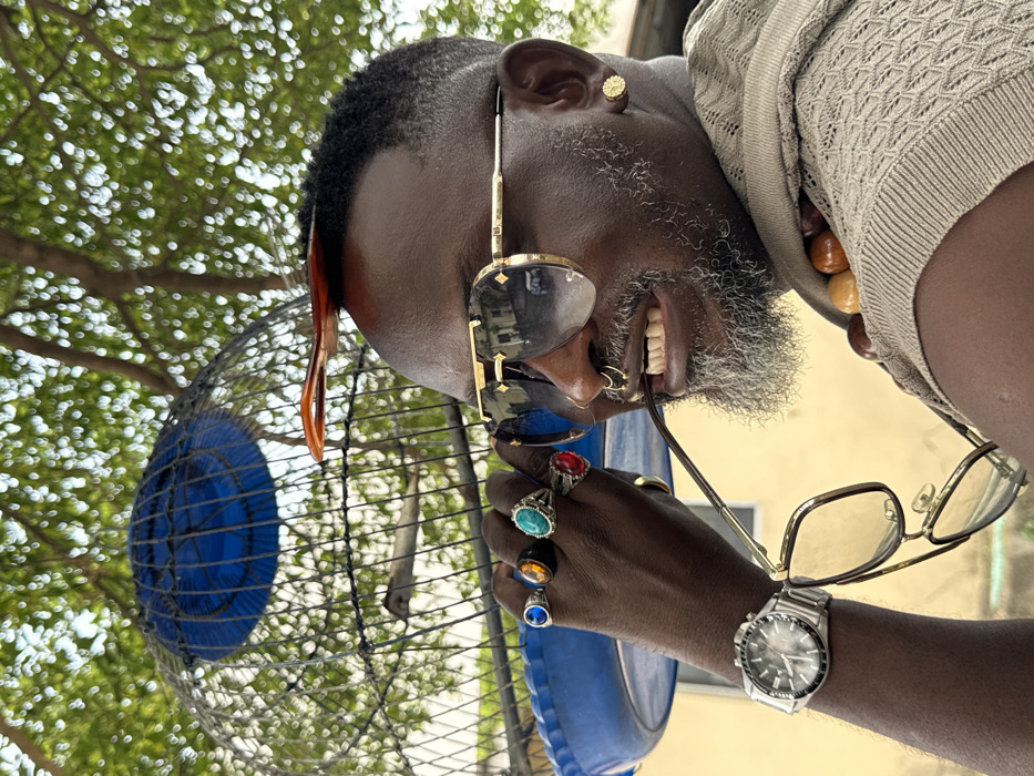 The image depicts a dark-skinned adult male in an outdoor setting in Ado, Nigeria, beneath the canopy of a tree with diffuse green foliage visible in the background. The man, positioned in profile facing right, has short, dark hair and a salt-and-pepper beard and mustache. He is wearing large aviator-style sunglasses with gold frames and gradient lenses. A silver septum ring is present in his nose, and a gold textured stud earring is in his right earlobe. He bites the arm of a second pair of gold-framed eyeglasses. An orange hair clip or comb is balanced horizontally on top of his head. His left hand, adorned with five prominent rings featuring blue, orange, turquoise, and red oval stones set in silver-colored bands, supports a large cylindrical wire birdcage with a blue plastic base and top. A small, light brown bird is visible inside the cage. On his left wrist, he wears a silver-colored wristwatch with a round face and metallic band. He is dressed in a light beige or brown knitted hooded garment, and a necklace of large, rounded, multi-colored wooden beads is visible around his neck. A light yellow building facade is faintly visible in the background.