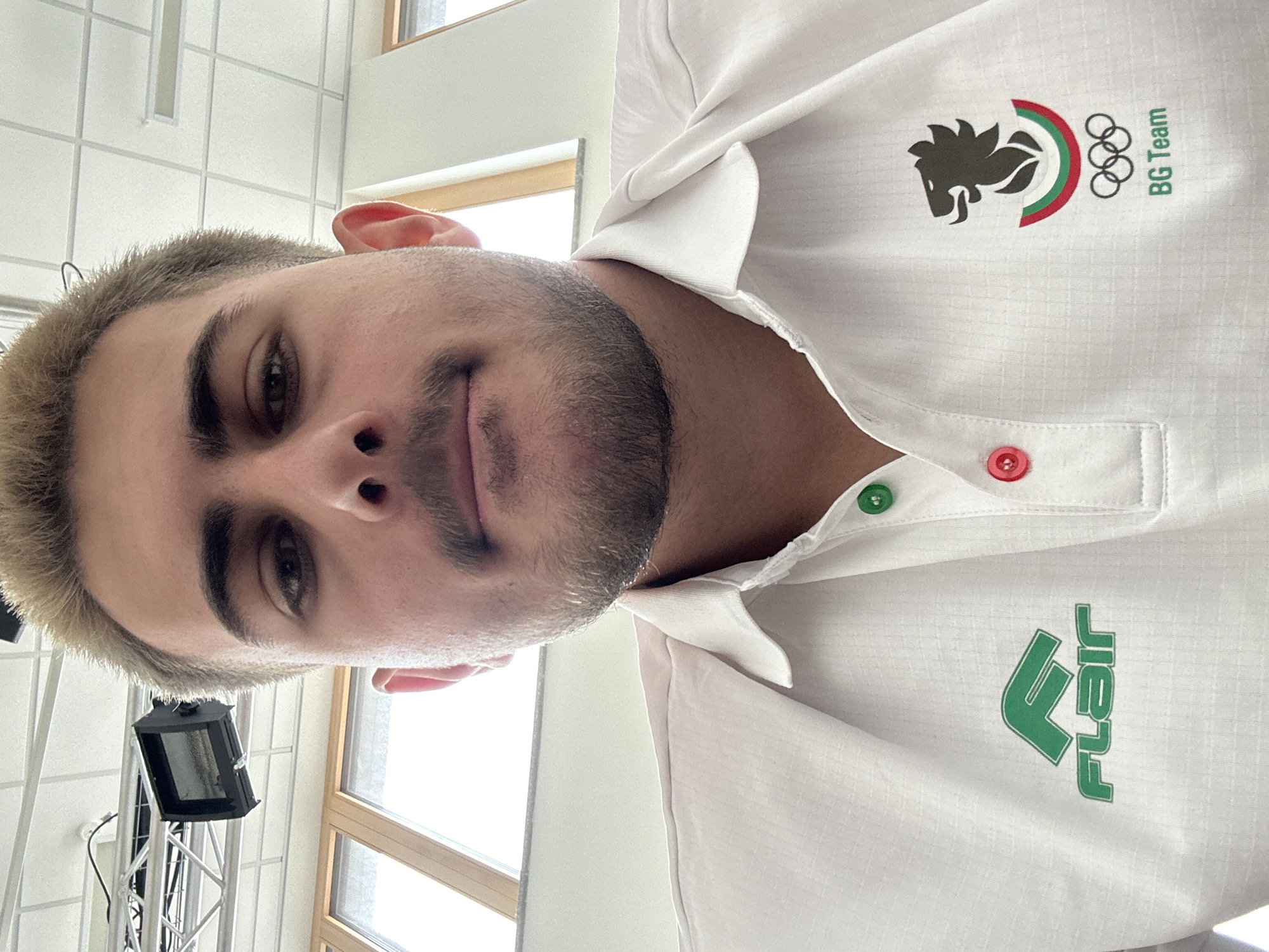 A male individual is depicted in a close-up, eye-level selfie shot, directly facing the camera. He has short, light-colored hair, dark eyebrows, and visible stubble on his chin and jawline. He is wearing a white collared polo shirt with a textured fabric pattern. On the wearer's left chest, a green "FLAIR" logo is visible. On the wearer's right chest, a black lion's head emblem sits above a stylized semi-circle in the colors of the Bulgarian flag (white, green, red), below which are the five Olympic rings and the text "BG Team" in green. The top visible button on the shirt collar is green, and the button below it is red. The background shows an indoor setting with a white grid ceiling featuring recessed lighting fixtures. A metal truss system, typically used for lighting or audio-visual equipment, is suspended from the ceiling, with a black rectangular light fixture attached. Several windows with light-colored wooden frames are visible in the upper background, admitting ambient light. The scene's details, including the Bulgarian national team attire and the professional event infrastructure in the background, indicate a sports or event venue, most likely the **Helmut-Körnig-Halle** in Dortmund, Germany, or an associated facility.