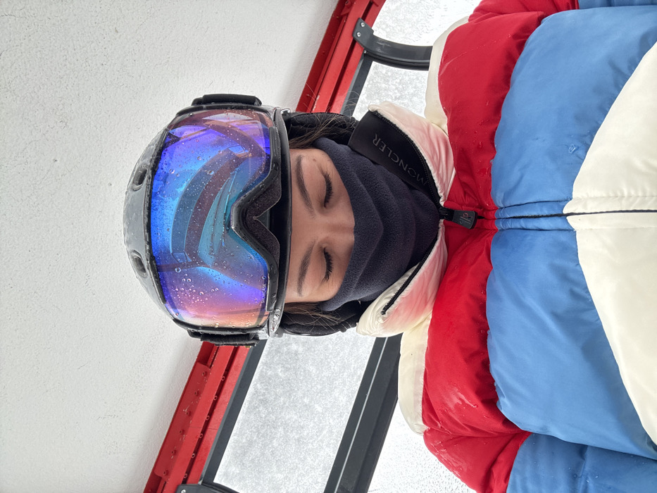 A person is wearing a red, white, and blue puffer jacket, a black neck gaiter, and ski goggles with a blue and purple reflective lens. The person's eyes are closed. Water droplets are visible on the goggles and the jacket. The background appears to be a ski lift and snowy scenery. The jacket's brand, "Moncler," is visible near the neck gaiter.
