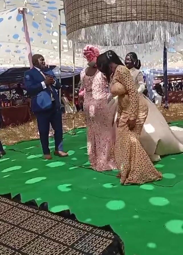 scene from an outdoor wedding celebration. A man in a blue suit stands on a green carpet, seemingly speaking into a microphone, with his right hand gesturing towards the crowd. Next to him are two women in ornate dresses. The woman closest to the camera wears a gold-patterned gown, while the other woman wears a pink, lace-like dress with a matching headwrap. Behind them is a bride in a white wedding gown, seated. The background shows other wedding guests and decorations. The camera is positioned from an angle, showcasing a table covered with patterned cloth in the foreground. A large, round chandelier hangs above the scene. The lighting is bright and suggests daytime.