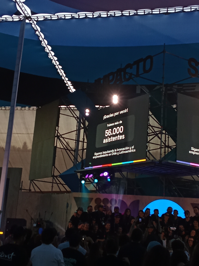 A partially obstructed view shows a large outdoor event with a stage. A screen displays the message "¡Gracias por venir! Fuimos más de 56.000 asistentes," which translates to "Thank you for coming! We were more than 56,000 attendees." The screen also promotes innovation and entrepreneurship in Chile and Latin America. Below the screen, a crowd of people is visible, some appearing to be part of an organized group. Bright lights shine on the stage, and a colorful awning covers the event space.