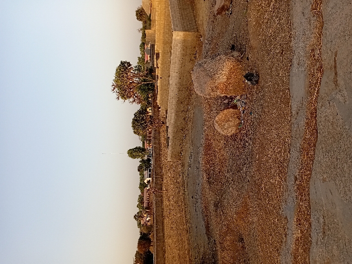 A landscape image shows a strip of land with sparse vegetation on the right. Two rocks sit among the dry grass. To the left, buildings and trees mark a settlement under a clear, light-blue sky. A wall borders the immediate right. A narrow path snakes parallel to the wall, suggesting a boundary or access road. The sun is likely low, casting long shadows.