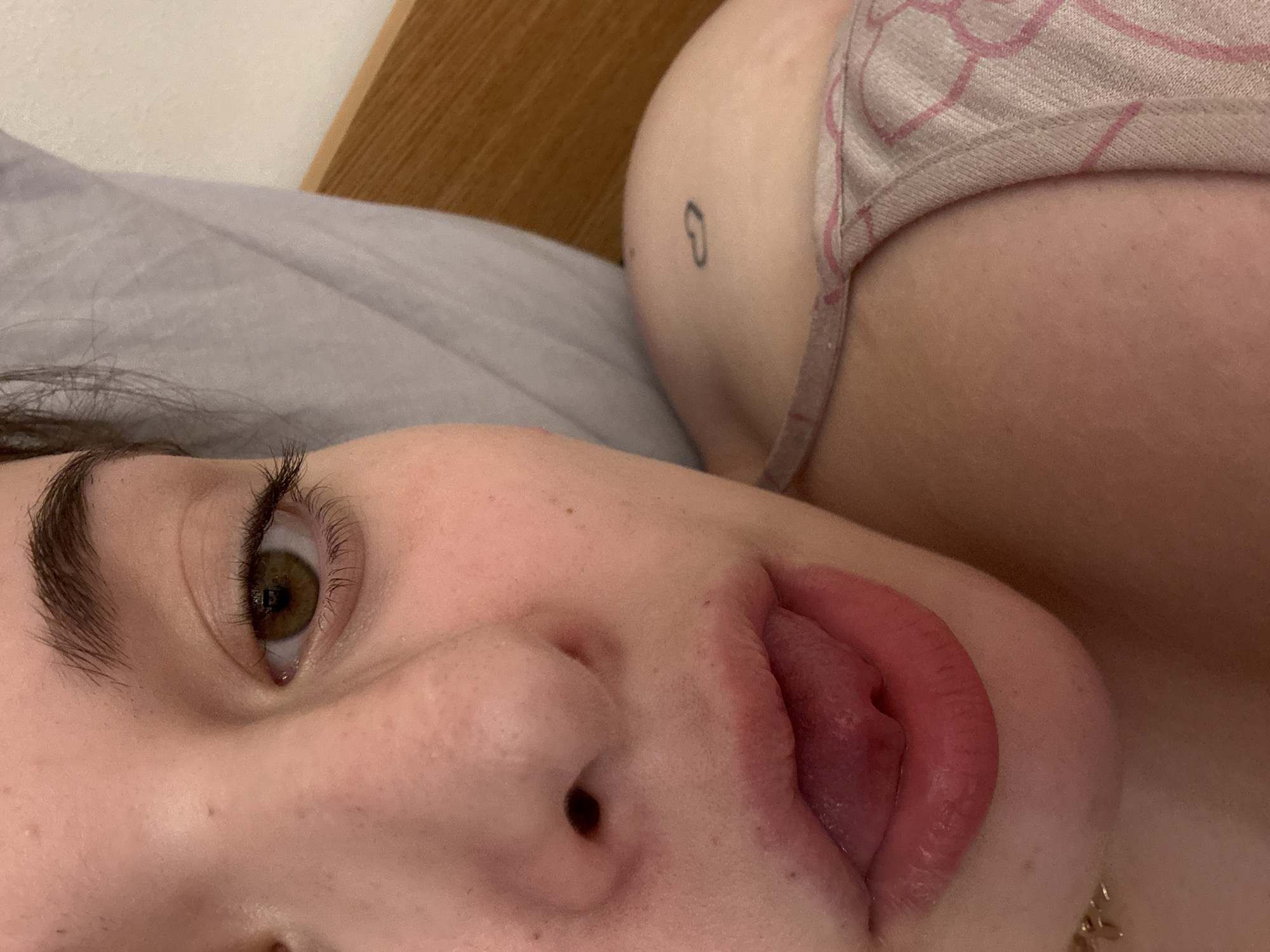 The image displays a close-up, high-angle view of an individual's upper body and partial face, located in the city of Troyan, Bulgaria. The subject's right eye, the bridge and nostrils of the nose, and the mouth with an extended tongue are visible. The eye presents a green/hazel iris, dark eyelashes, and a visible tear duct. Dark, thick eyebrows are present. The skin is fair with scattered freckles. Dark hair strands are visible near the forehead. The lips are full and reddish-pink, with the tongue extended outwards. A small, black, outline heart tattoo is visible on the upper part of the right shoulder. A light-colored garment with a pink patterned design, likely a bra or camisole strap, is visible over the right shoulder and upper chest. A faint gold-colored chain is partially visible around the neck. The background consists of a light grey textile, possibly a pillow or blanket, and a segment of a light-colored wooden structure, consistent with a bed frame or headboard.