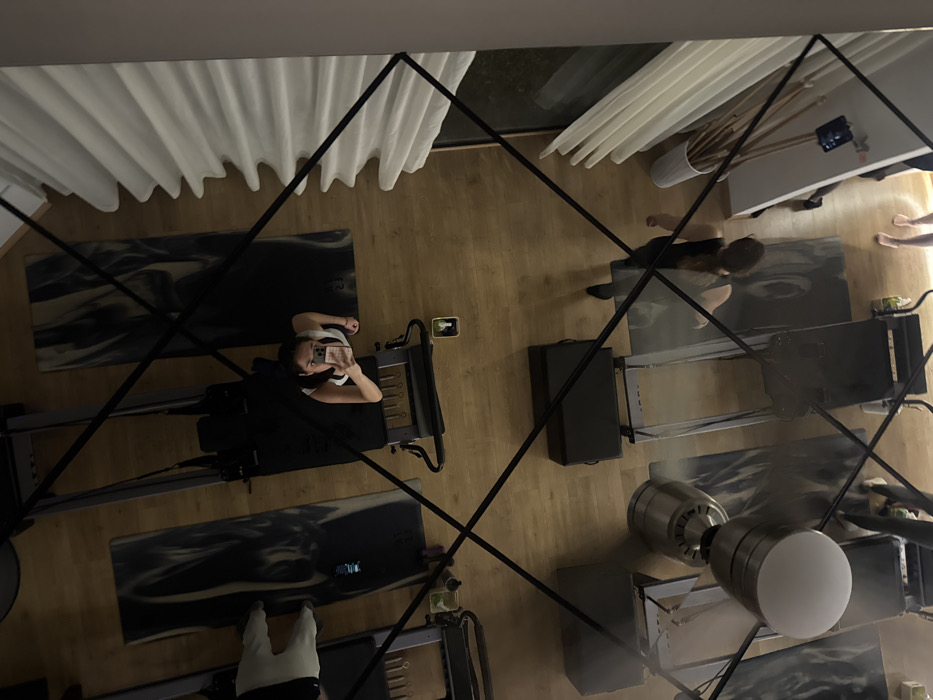 A mirrored room reveals a Pilates studio. Several reformer machines are arranged on wooden floors, each paired with a black and grey marbled mat. Curtains line the upper edge of the frame. A woman lies on a reformer, holding a phone and capturing a selfie. Other individuals are present in the studio. The mirror's frame, composed of intersecting black lines, segments the view. A fan is visible near the bottom right, partially obscured by the mirror frame.