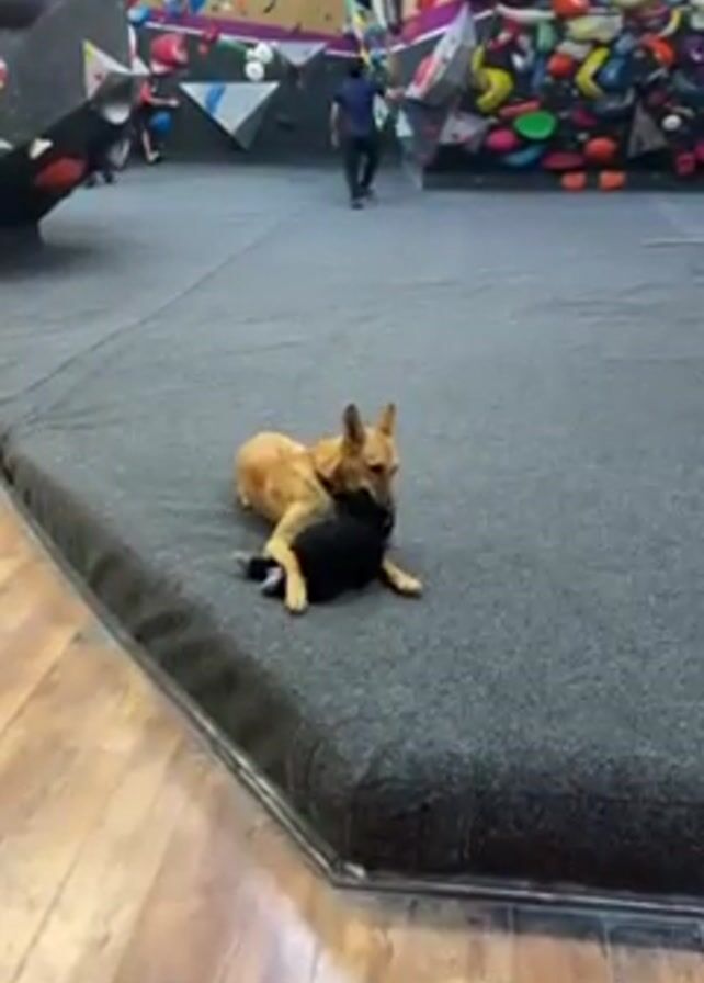 dog lying on a gray crash pad in an indoor climbing gym