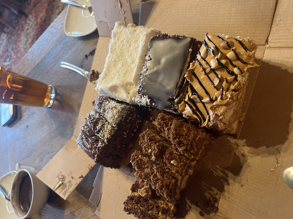 - "The scene depicts an assortment of sliced cakes within an open cardboard box, resting on a wooden table in the city of Argveta, Georgia" by FM-l44z72, licensed under CC BY 4.0