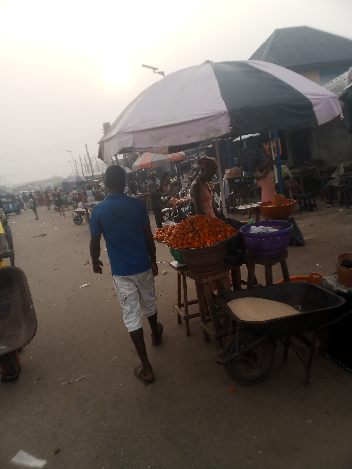 A busy market scene under a hazy sky. A man in a blue shirt and white shorts walks away from the camera. A vendor stands by a table laden with orange fruits beneath a large umbrella. Wheelbarrows, one filled with light-colored grain, are nearby. Other people and market stalls fill the background, giving the impression of a bustling marketplace.