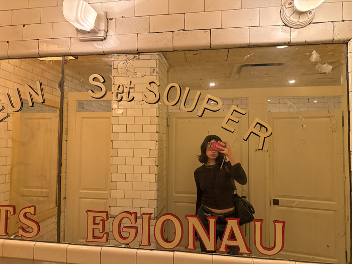 A person in a dark, fitted long-sleeve shirt and jeans takes a mirror selfie in a tiled bathroom. The mirror features vintage, faded lettering in two fonts and colors. The top text, "Set SOUPER," is in yellow with a black outline. Below, "EGINAU" is in red with a black outline. Visible behind the person are bathroom stalls with cream-colored doors and white brick walls. Fixtures like a white paper towel dispenser and a light fixture are visible above the mirror.