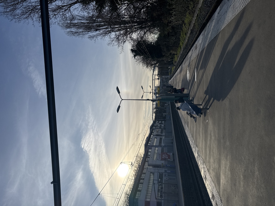 A train platform scene during the day. People are waiting, casting long shadows. A train track runs along the edge of the platform, parallel to a building with advertisements. Streetlights illuminate the platform. Above, a clear blue sky transitions to a lighter hue near the horizon where the sun shines. Trees line the far side of the tracks and a thick, dark, black pole runs vertically on the left side of the frame.