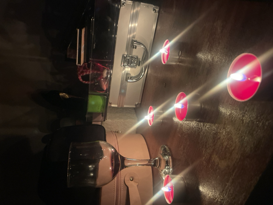 The image displays an indoor scene located in Blagoevgrad, Bulgaria, under low light conditions. The primary illumination originates from six lit tea-light candles with red wax, housed in silver-colored metal casings, which are scattered across a dark wooden surface, likely a table. Each candle exhibits a visible flame, producing prominent lens flares. On the left side of the wooden surface, a clear glass wine goblet is present, containing a quantity of dark red liquid. Behind the wine glass, a light pink, rounded object with a visible handle and zipper details is situated, resembling a small travel or cosmetic case. To the right, resting on the same wooden surface behind the candles, is a rectangular metallic silver carrying case, equipped with a top handle and two visible latches. Positioned on top of the silver case is a clear, segmented organizer. The left segment of this organizer contains a small green object, the central segment holds a patterned red and white item, and the right segment contains an indistinct dark object. The background beyond these items is dark and out of focus, without specific discernible features. No individuals are visible in the frame.