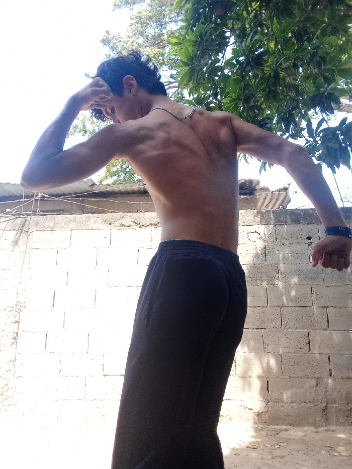 A male individual is depicted outdoors in Juan Griego, Venezuela. The subject is seen from the back, slightly angled, standing shirtless and wearing dark-colored sweatpants. He possesses a muscular physique, evident in his back and shoulder definition. A thin silver-colored chain is visible around his neck. His left arm is bent, with the hand positioned near his head, while his right arm is extended to the side with a clenched fist. Multiple dark wristbands adorn his right wrist. The background consists of a light-colored, possibly concrete, block wall. Above the wall, green tree foliage is visible against a brightly illuminated sky, indicating daylight.