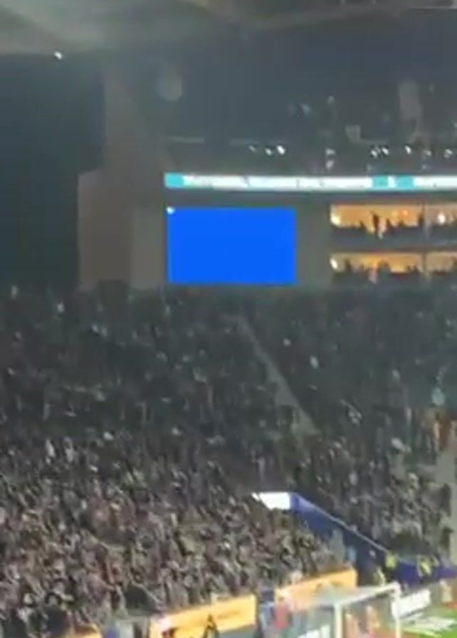 soccer stadium at night. A large crowd fills the stands, and the field is illuminated by bright lights. Several players in red and white uniforms are visible on the field, likely warming up or celebrating a goal. A large electronic scoreboard displays the word "Golo," suggesting a recent score. The camera is positioned within the crowd, providing a spectator's perspective. People are visible in the foreground, some holding up their phones, likely recording the moment. The atmosphere appears lively and energetic.